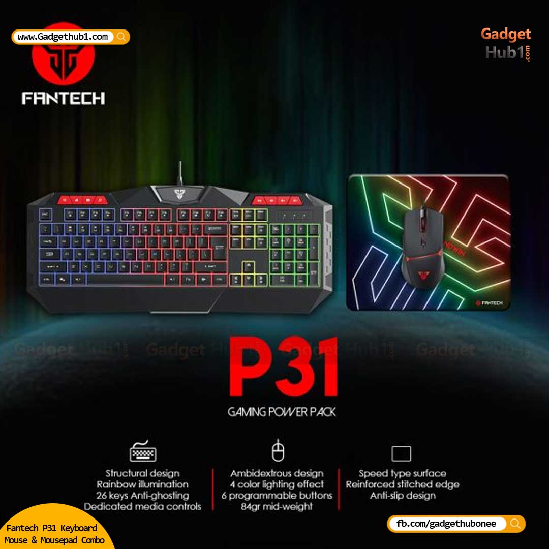 Fantech P31 model comes with Keyboard, Mouse & Mousepad Combo. In this Combo, the keyboard is featured with Structural design Rainbow illumination 26 keys Anti-ghosting Dedicated media controls, The mouse comes with Ambidextrous design 4 color lighting effect 6 programmable buttons Mgr mid-weight, and the mouse pad is designed with Speed type surface Reinforced stitched edge Anti-slip design.