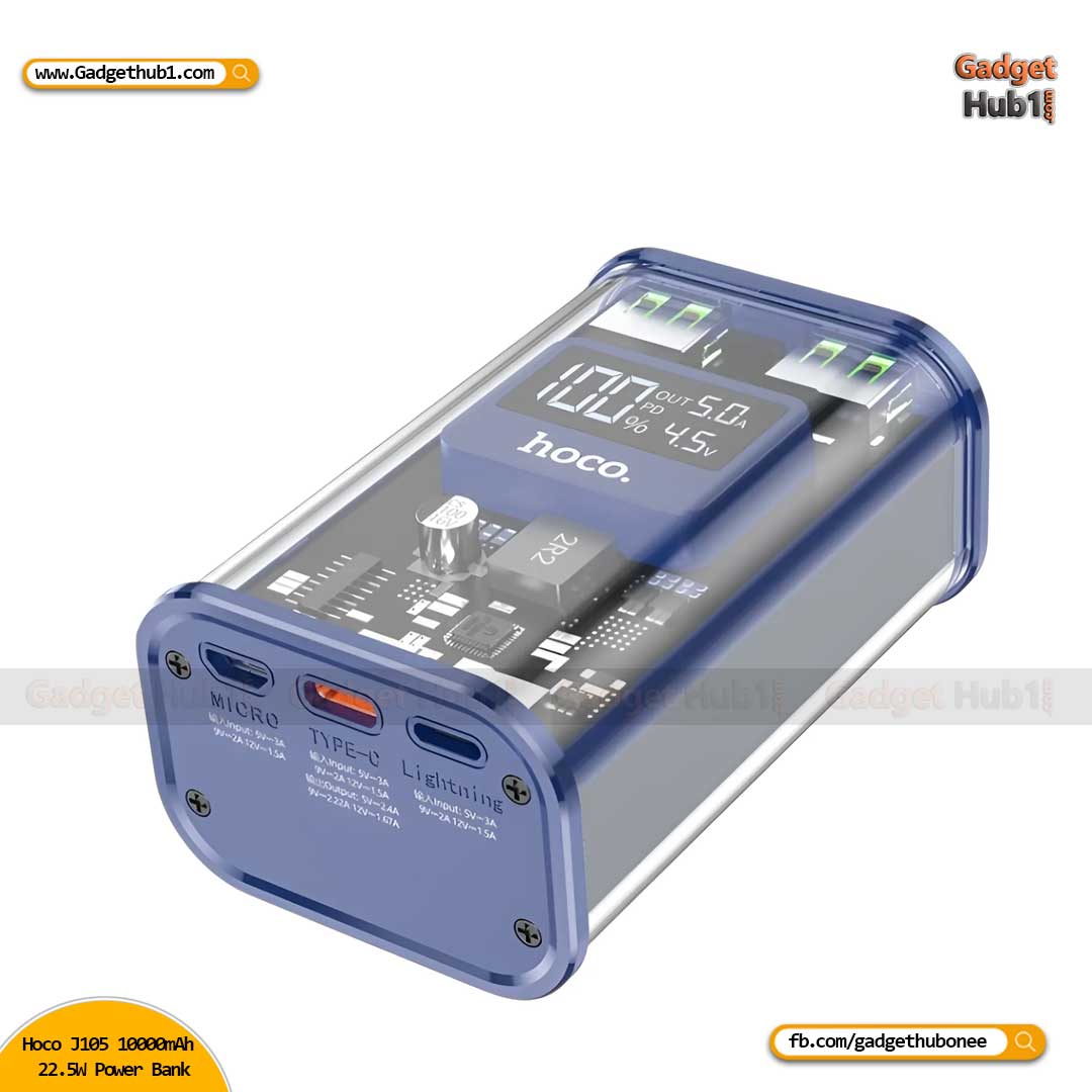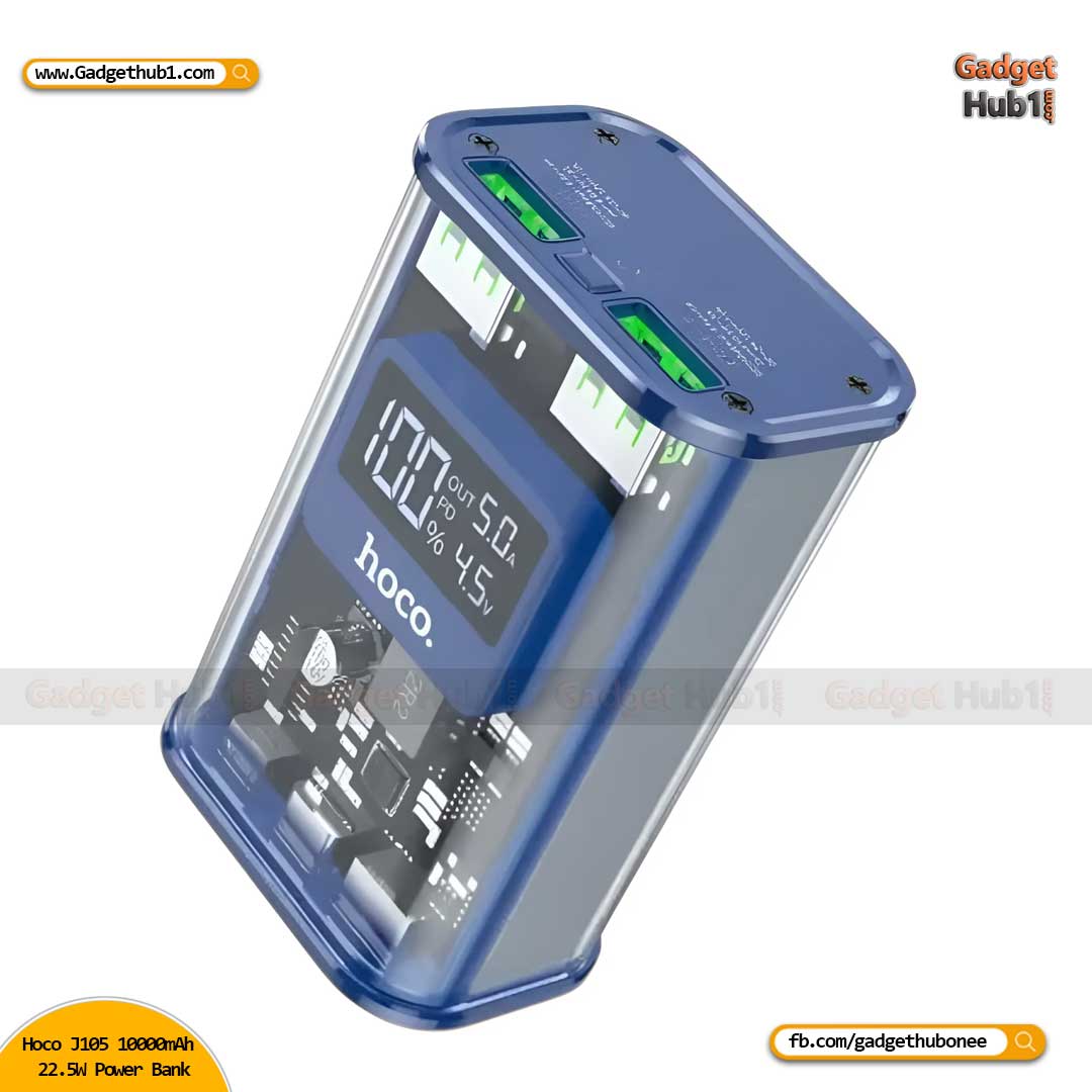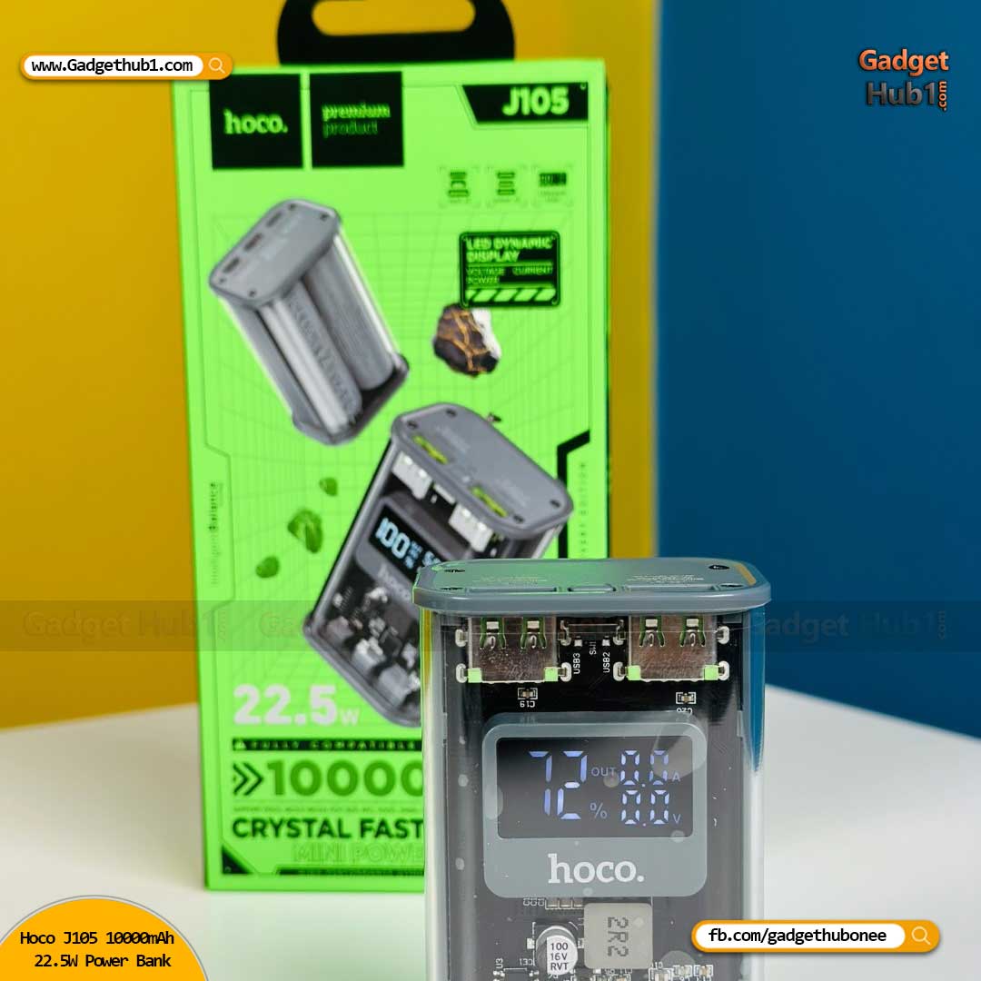 The Hoco J105 10000mAh 22.5W Fast Charging Digital Display Power Bank is now available in Bangladesh. Get the original products at the most affordable price only at GADGETHUB1.COM and enjoy the quality with the promise of the best customer service in Bangladesh.